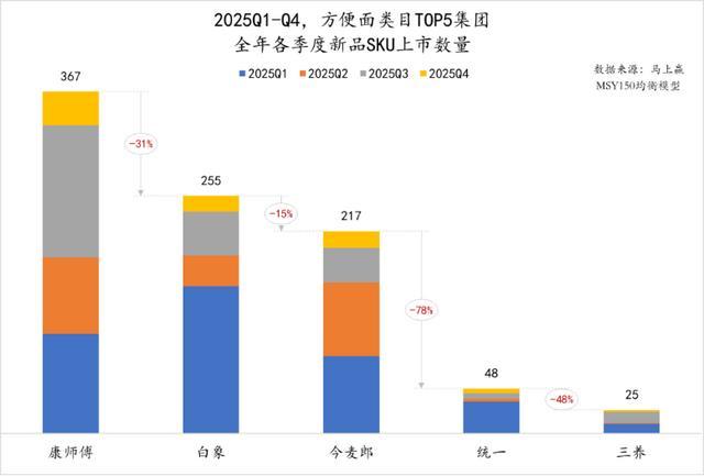 根据“马上赢”数据,康师傅去年共推出367款新品SKU,但康师傅新品在2025年第四季度仅贡献了2.51%的市场份额;白象、今麦郎的新品贡献度更不足1%。