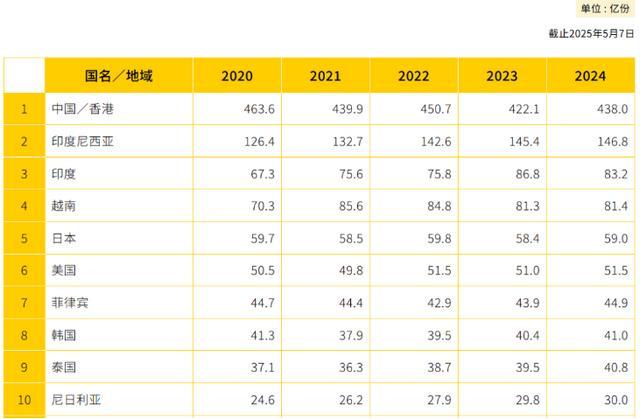 根据世界方便面协会数据,2020-2024年,中国方便面的消费量从463.6亿包跌至2024年的438亿包,减少了约25亿包。