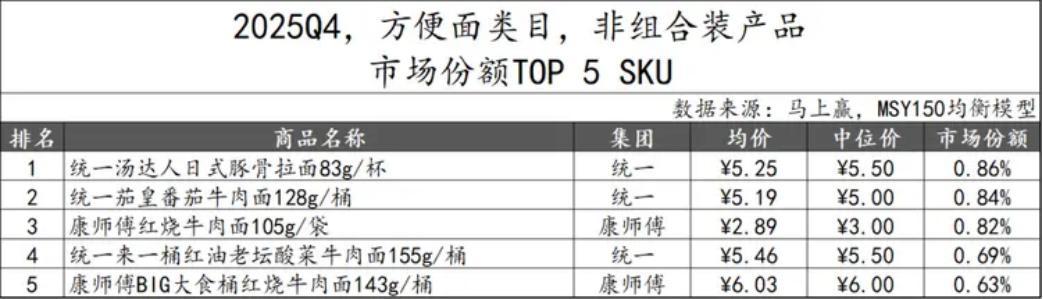 数据显示,2025年Q4,中国方便面市场CR5(康师傅、统一、白象、今麦郎、三养)的集中度高达84.18%,但稍低于上季度的87.15%,“双雄”格局正在松动。